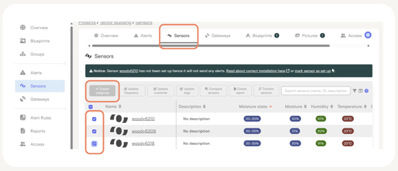 For larger projects, we strongly recommend creating subgroups for the various areas of the building being monitored. This approach provides a clearer overview of moisture readings, simplifies sensor data comparison, and ensures that no critical alerts are missed—making moisture monitoring significantly more efficient and manageable.