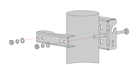 2. Position the pole clamps together around the pole, then tighten them with bolts, washers, and nuts.