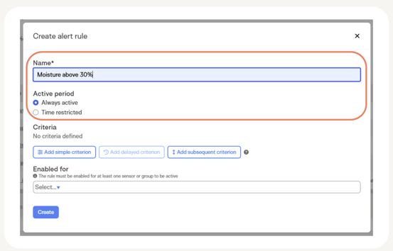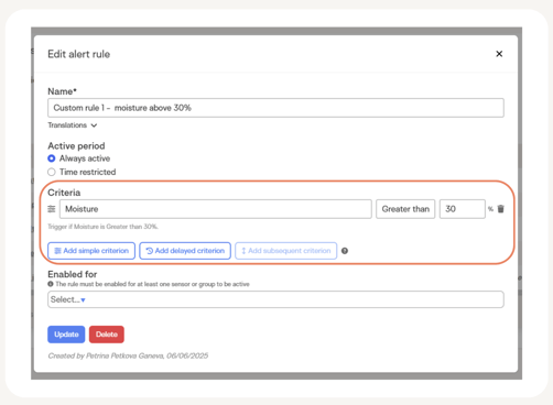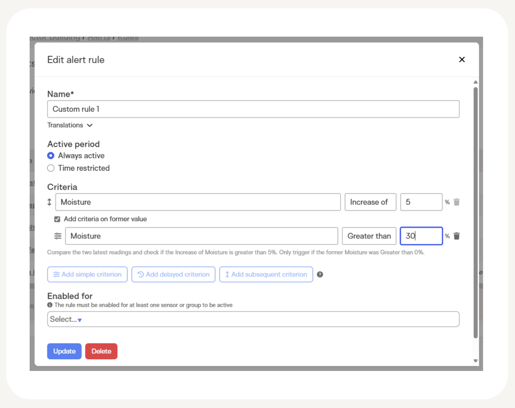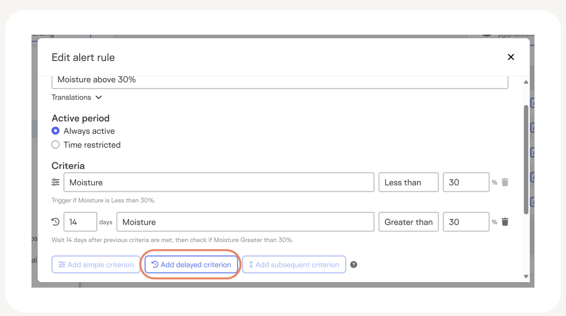 You can add a delayed criterion, which means that an alert will be triggered with a delay after a condition is met. In this case, we added a 14 days delay, which means that if 14 days after the first time the moisture reached 30%, the value is still the same or higher, then an alert will be triggered.