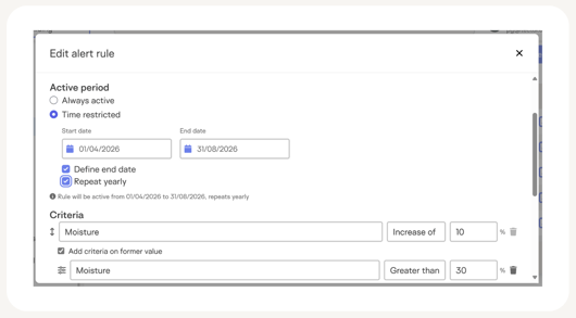 - Otherwise, you can select Time restricted, when you want the alert rule to start being active after a certain point in time (e.g. after sensors have been installed). You can also add an end date, for example, when a a certain part of the building is fully closed and you are no longer monitoring for a given criterion. You can also choose an alert rule to repeat yearly, if you are monitoring a seasonal phenomenon, such as summer condensation in warm roofs.