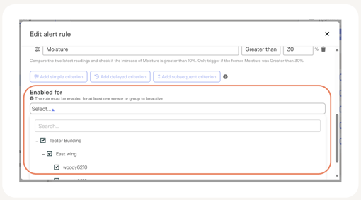 - Press Enabled for and from the dropdown menu select either the whole group, a subgroup, or individual sensors.
