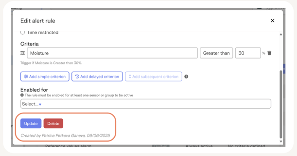 - You will be presented with a dialogue window, where you can make any necessary changes, or delete the rule entirely. Furthermore, at the bottom of the window, you can see who created the rule and who last edited it.