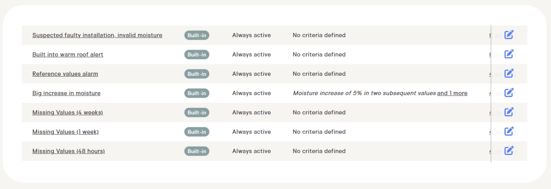 - Built into warm roof moisture alert: This alert is specifically designed for sensors placed in warm roofs and indicates a sudden big increase in moisture, which could be a sign of a leak in the roof.