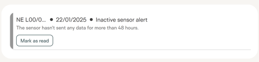 - Invalid measurements alert: When a sensor has been setup (by scanning the QR code and following the steps), and the first transmission after the setup shows an invalid moisture measurement, then you will receive an alert suggesting there may be a faulty installation.